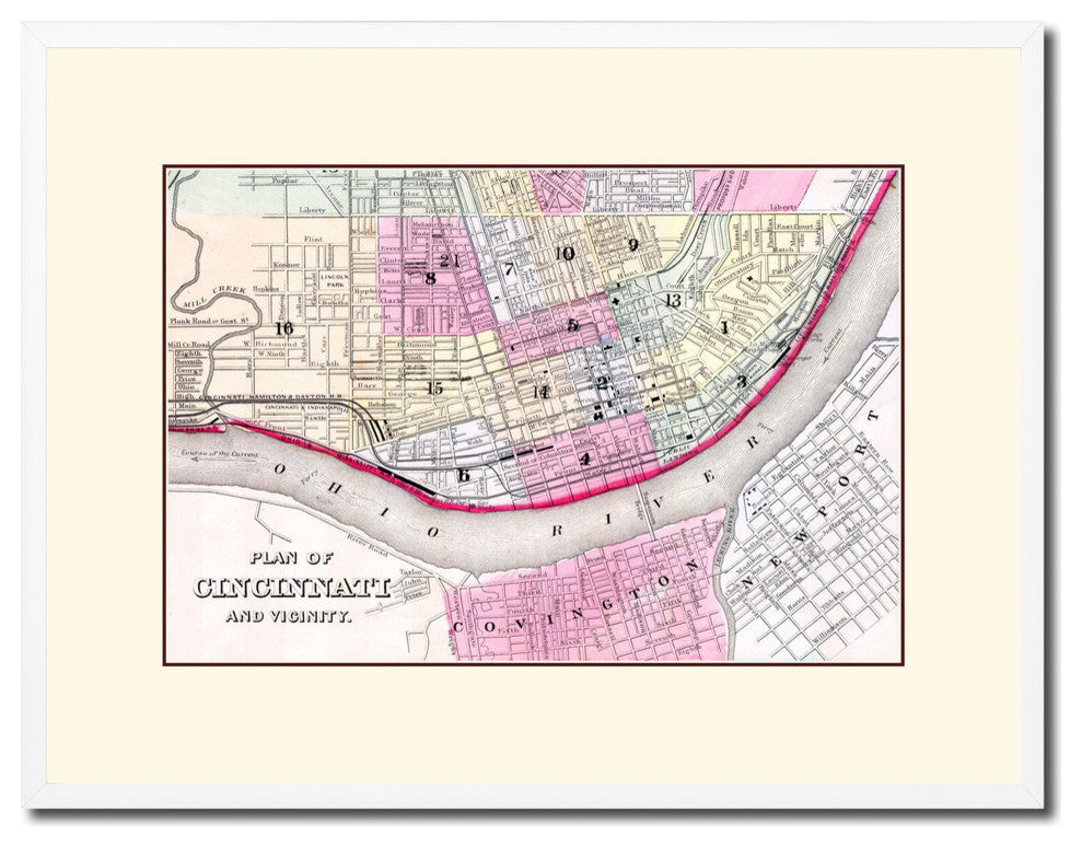 Cincinnati Old Map Print On Canvas With Picture Frame Art Collection 16" X 21"