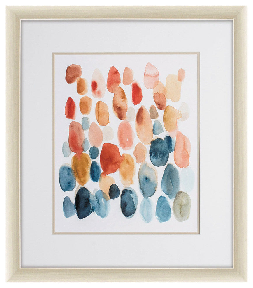 A colorful abstract print is double matted in white and oyster. Framed in an angled profile moulding with a champagne gold finish.
