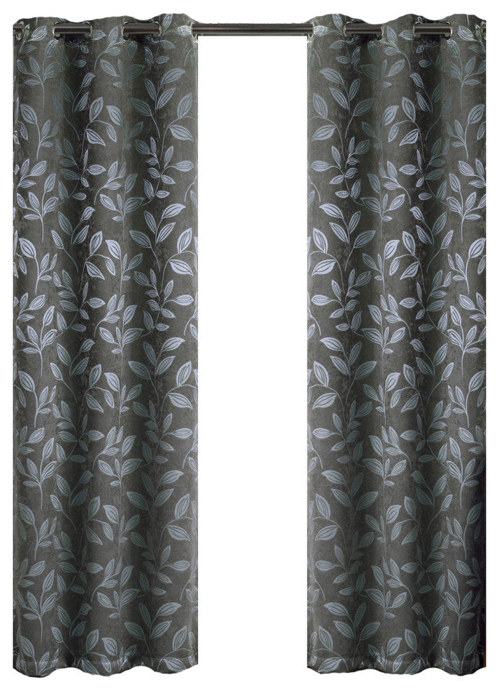 Withdraw to your inner sanctuary with these jacquard blackout curtains. These insulated curtains feature faux suede material and thermal insulation, with a leafy weave, that guards your room from heat and cold while reducing noise, making them perfect for anyone who needs a quiet, restful environment. - 100% polyester- Sold in pairs - Blackout fabric weave- Blocks over 85% of light than ordinary curtains- Saves on home heating and cooling costs- Panels provide noise reduction and privacy- Machine-washable Available Sizes Include: 72 x 84" (36 x 84" each.)