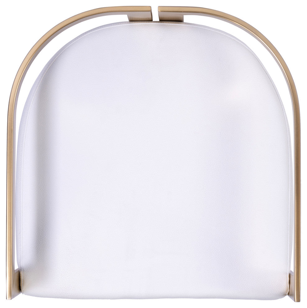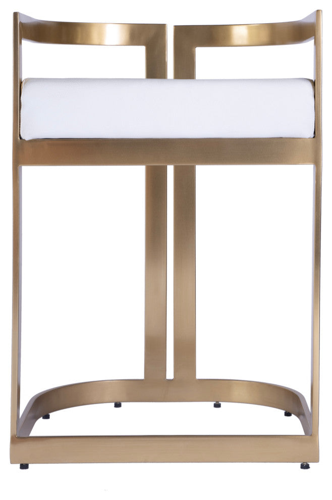 Furnish your kitchen or bar area in contemporary style with this soft curve lumbar frame dining stool. The high polish solid stainless steel frame provides a sturdy base, while the plush faux leather seat ensures maximum comfort. The combination of angles and gentle curves gives this stool an eye-catching appearance, while the neutral color allows it to match well with any decor. Color is gold and white Crafted from stainless steel, plyboard, foam and faux leather Lacquer finished and plated stainless steel frame with plywood seat base with a faux leather cushion filled with tris foam Stool shape is square with a half moon seat Stool measures 18.25"W x 18.25"D x 27"H and weight is 10 lbs Seat height is 23" with a back height of 4"H Item arrives fully assembled Cushion width is 3.50" Seat depth is 18" Weight capacity is 300 lbs Ideal for use in a Kitchen, Dining Room, or Pub Photo may slightly differ from actual item in terms of color/finish due to the lighting during photo shoot or the monitor''s display
