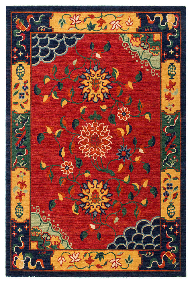 This design is one of the most beloved in Tibet and it is woven here with strong red center ground decorated with the three lotuses of purity and perfection. The four corners include symbols of water and earth with border includes symbols of good fortune and well being. This resilient but soft all wool rug with bamboo silk accents, is included in the Tibetan Hybrid Collection created by Tibetan Rug experts, InnerAsia Rugs. It was made on a mechanized loom with the exacting attention to detail and masterful interplay of color and texture that captures the essence and appeal of Tibetan hand crafted carpets. Designed and created by InnerAsia Rugs China.