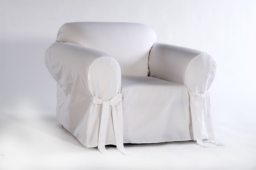 One piece cotton duck soft chair slipcover with ties at the front and back to keep the cover in place made in China machine washable easy to installfits chair from 30" to 48" wide, measured from outside arm to the other outside arm square cushion100% cotton