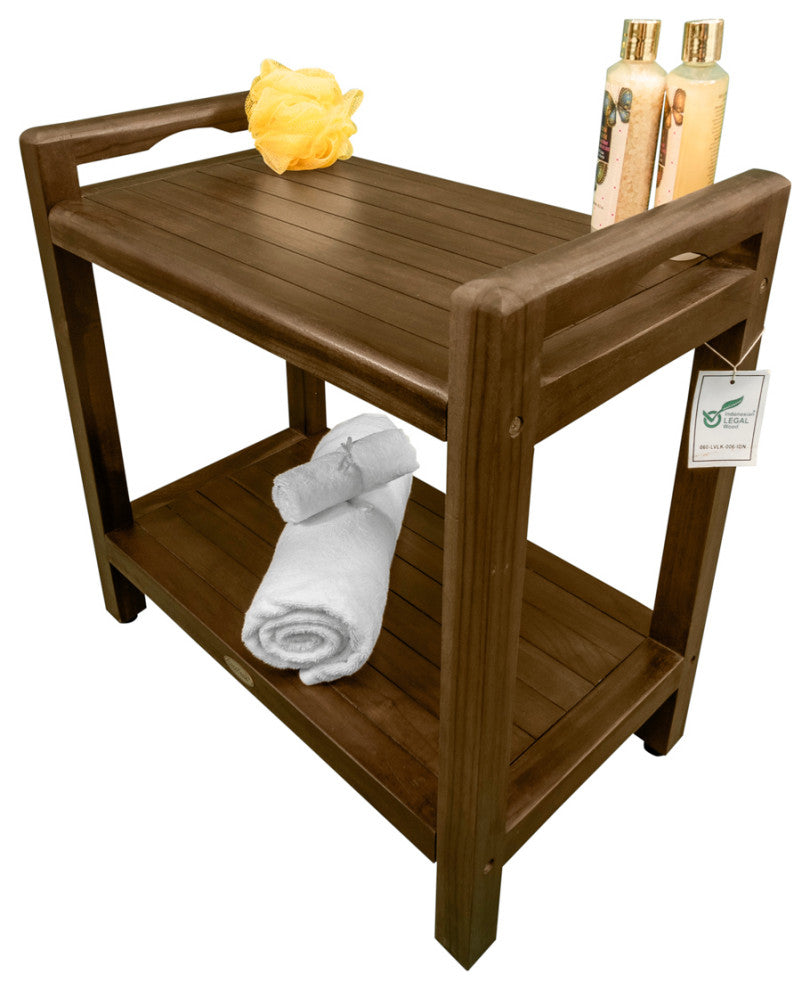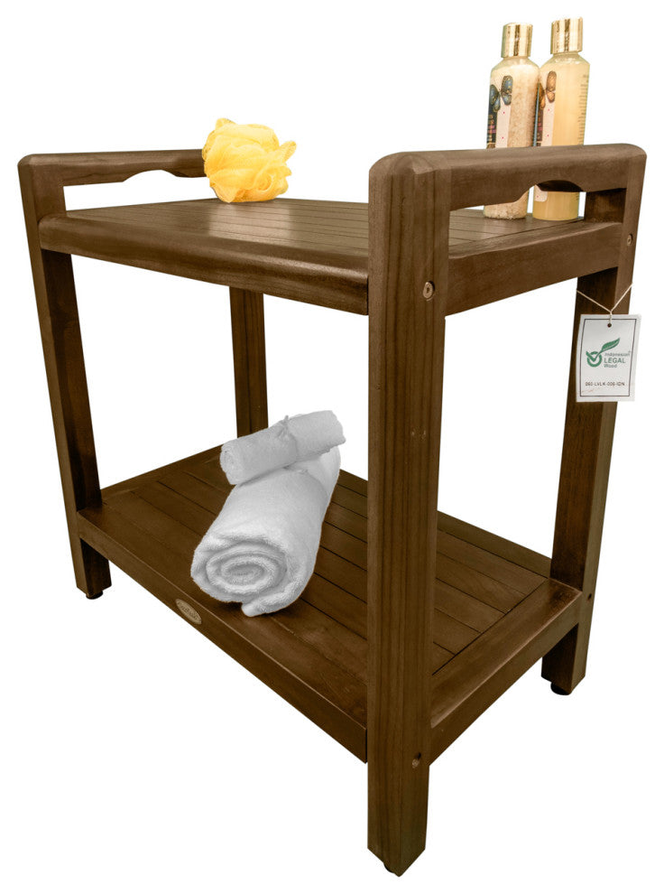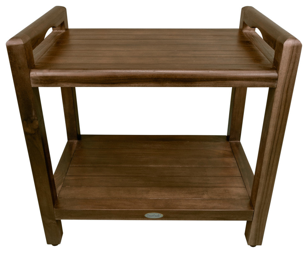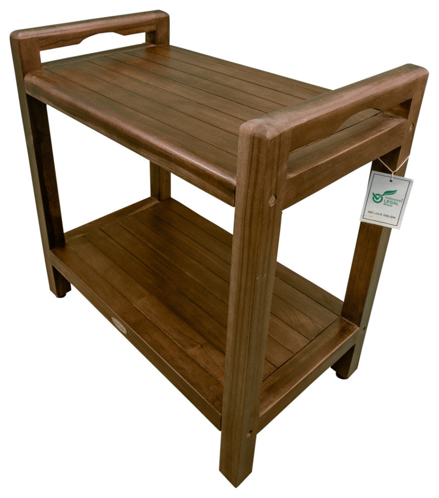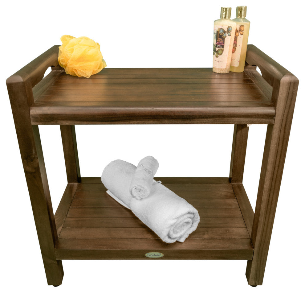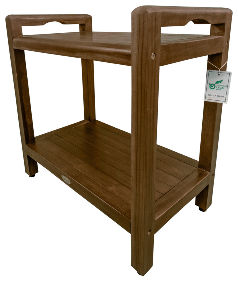 Deco Teak LiftAide ergonomic shower bench provides a combination of comfort and elegance to your shower, bathroom, patio, or living area. Arrives pre-stained from our factory with a durable indoor outdoor stain with added mildew and fungus resistors in a rich brown tone. Extensive clinical research has shown that by simply providing arms to assist in lifting out of a chair, the added leverage can increase efficiency by almost 200%. The LiftAide arms are designed to be sturdy, and steady to provide that added support and assistance when lifting out of the shower chair. They also provide a handy surface for hanging towels on, and can double as a towel rack once you are out of the shower. An included utility shelf provides additional storage and easy access for your toiletries, or other essential items. Teak is naturally water, mold, and mildew resistant due to its natural density and high oil content. It has been the wood of choice for hundreds of years of luxury boat builders. It provides the ability for this teak furniture to be used outdoors as well as indoors. Please Note: Some Assembly is required