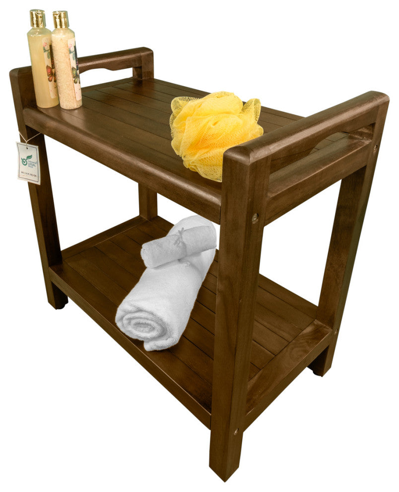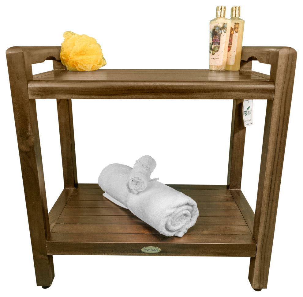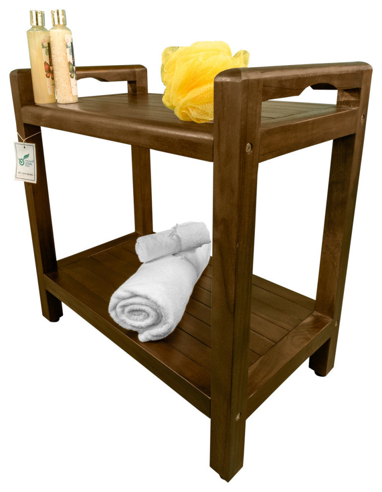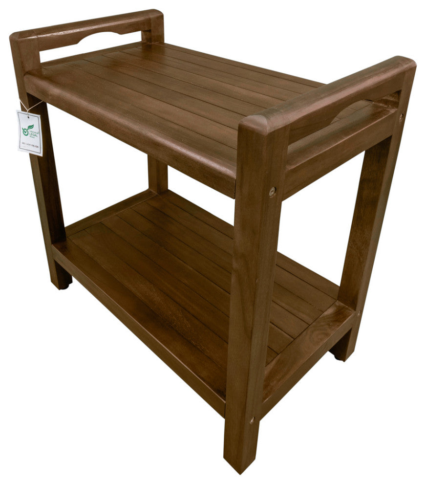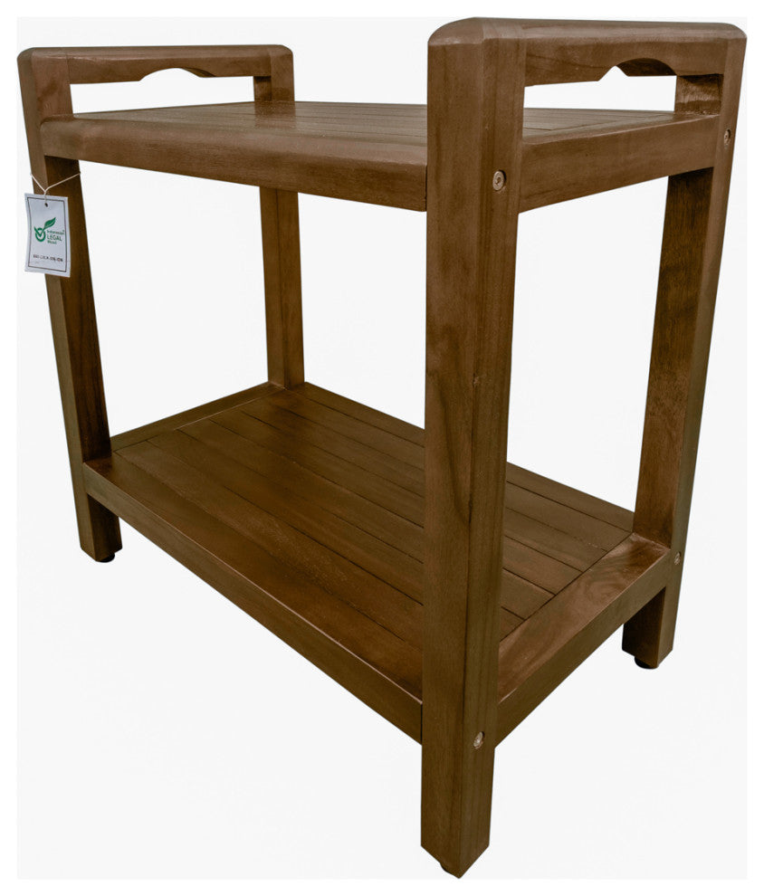 Deco Teak LiftAide ergonomic shower bench provides a combination of comfort and elegance to your shower, bathroom, patio, or living area. Arrives pre-stained from our factory with a durable indoor outdoor stain with added mildew and fungus resistors in a rich brown tone. Extensive clinical research has shown that by simply providing arms to assist in lifting out of a chair, the added leverage can increase efficiency by almost 200%. The LiftAide arms are designed to be sturdy, and steady to provide that added support and assistance when lifting out of the shower chair. They also provide a handy surface for hanging towels on, and can double as a towel rack once you are out of the shower. An included utility shelf provides additional storage and easy access for your toiletries, or other essential items. Teak is naturally water, mold, and mildew resistant due to its natural density and high oil content. It has been the wood of choice for hundreds of years of luxury boat builders. It provides the ability for this teak furniture to be used outdoors as well as indoors. Please Note: Some Assembly is required