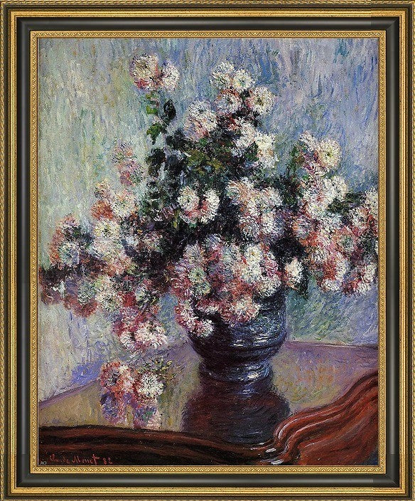 20" x 25" Claude Oscar Monet Chrysanthemums framed premium canvas print reproduced to meet museum quality standards. Our Museum quality canvas prints are produced using high-precision print technology for a more accurate reproduction printed on high quality canvas with fade-resistant, archival inks. Our progressive business model allows us to offer works of art to you at the best wholesale pricing, significantly less than art gallery prices, affordable to all. This artwork is hand stretched onto wooden stretcher bars, then mounted into our 3 3/4" wide gold finish frame with black panel by one of our expert framers. Our framed canvas print comes with hardware, ready to hang on your wall. We present a comprehensive collection of exceptional canvas art reproductions by Claude Oscar Monet.