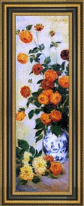 14" x 28" Claude Oscar Monet Dahlias framed premium canvas print reproduced to meet museum quality standards. Our Museum quality canvas prints are produced using high-precision print technology for a more accurate reproduction printed on high quality canvas with fade-resistant, archival inks. Our progressive business model allows us to offer works of art to you at the best wholesale pricing, significantly less than art gallery prices, affordable to all. This artwork is hand stretched onto wooden stretcher bars, then mounted into our 3 3/4" wide gold finish frame with black panel by one of our expert framers. Our framed canvas print comes with hardware, ready to hang on your wall. We present a comprehensive collection of exceptional canvas art reproductions by Claude Oscar Monet .