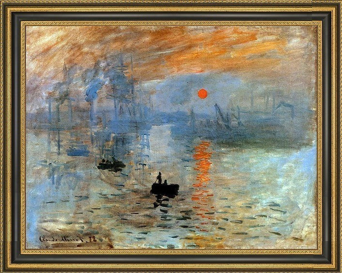 21" x 28" Claude Oscar Monet Impression- Sunrise framed premium canvas print reproduced to meet museum quality standards. Our Museum quality canvas prints are produced using high-precision print technology for a more accurate reproduction printed on high quality canvas with fade-resistant, archival inks. Our progressive business model allows us to offer works of art to you at the best wholesale pricing, significantly less than art gallery prices, affordable to all. This artwork is hand stretched onto wooden stretcher bars, then mounted into our 3 3/4" wide gold finish frame with black panel by one of our expert framers. Our framed canvas print comes with hardware, ready to hang on your wall. We present a comprehensive collection of exceptional canvas art reproductions by Claude Oscar Monet.