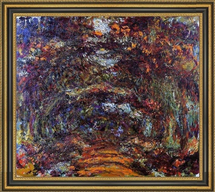 16" x 20" Claude Oscar Monet The Path under the Rose Arches Giverny framed premium canvas print reproduced to meet museum quality standards. Our Museum quality canvas prints are produced using high-precision print technology for a more accurate reproduction printed on high quality canvas with fade-resistant, archival inks. Our progressive business model allows us to offer works of art to you at the best wholesale pricing, significantly less than art gallery prices, affordable to all. This artwork is hand stretched onto wooden stretcher bars, then mounted into our 3 3/4" wide gold finish frame with black panel by one of our expert framers. Our framed canvas print comes with hardware, ready to hang on your wall. We present a comprehensive collection of exceptional canvas art reproductions by Claude Oscar Monet.