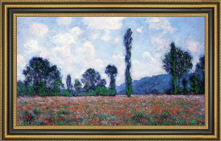 16" x 24" Claude Oscar Monet Poppy Field- Giverny framed premium canvas print reproduced to meet museum quality standards. Our Museum quality canvas prints are produced using high-precision print technology for a more accurate reproduction printed on high quality canvas with fade-resistant, archival inks. Our progressive business model allows us to offer works of art to you at the best wholesale pricing, significantly less than art gallery prices, affordable to all. This artwork is hand stretched onto wooden stretcher bars, then mounted into our 3 3/4" wide gold finish frame with black panel by one of our expert framers. Our framed canvas print comes with hardware, ready to hang on your wall. We present a comprehensive collection of exceptional canvas art reproductions by Claude Oscar Monet .