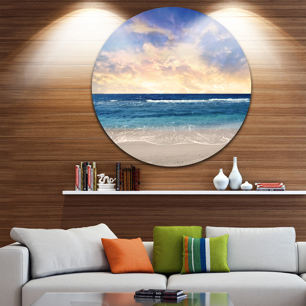 Bring Contemporary Abstraction to your home with this large Circle Metal wall art. This Clear Blue Sky and Ocean at Sunset Metal Artwork makes it the focal point of any room or office.