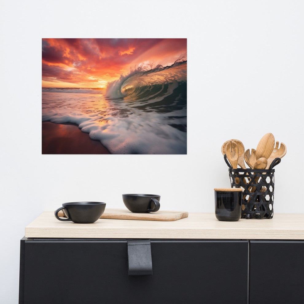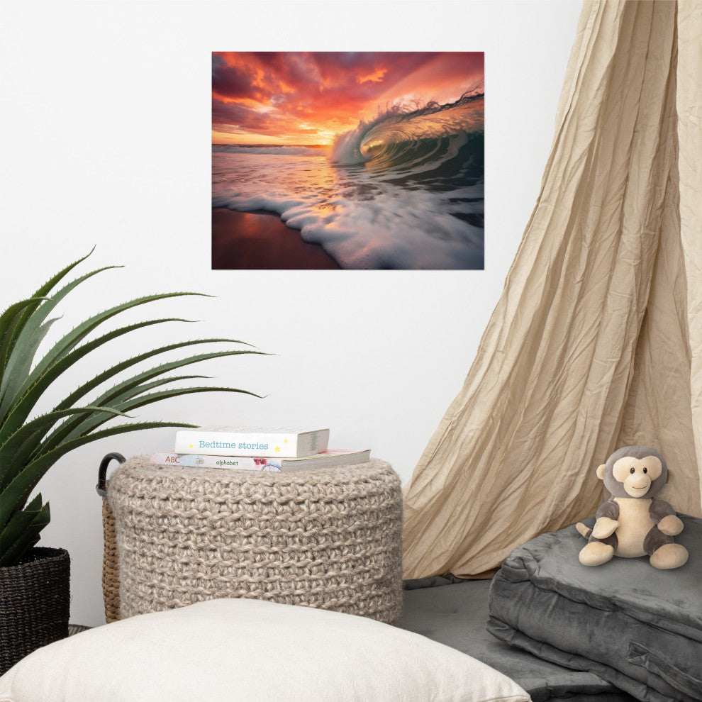 Coastal Art: Golden Barrel Photorealistic Digital Artwork Loose Art PrintExperience the dramatic beauty of the ocean meeting a fiery sunset with "Golden Barrel," a captivating photorealistic digital artwork. This piece masterfully captures the moment a powerful wave forms a perfect barrel, its illuminated by the rich golden and fiery hues of the setting sun. The contrast between the dynamic energy of the wave and the breathtaking colors of the sky creates a truly mesmerizing scene.This high-quality loose art print allows you to personalize its presentation with a frame that complements your unique style. Imagine this striking artwork as a bold statement piece in your living room, adding a touch of dramatic beauty to a home office, or bringing the vibrant energy of the ocean to a bedroom. Let "Golden Barrel" infuse your space with the awe-inspiring power and beauty of nature.Details:Title: Golden BarrelType: Loose Art Print (unframed)Subject: Ocean Wave, Sunset, SeascapeStyle: Photorealistic, Digital ArtMood: Dramatic, Vibrant, Awe-InspiringPerfect for: Living rooms, home offices, bedrooms, coastal-inspired décor, anyone who appreciates the power and beauty of the ocean at sunset.Please Note: This is an unframed print. You will need to purchase a frame separately. Please be aware that the colors displayed on your monitor may vary slightly from the actual print.Processing, Shipping and Returns:This unframed artwork is made especially for you as soon as you place an order, which is why it takes us a bit longer to deliver it to you. Making products on demand instead of in bulk helps reduce overproduction, so thank you for making thoughtful purchasing decisions!Returns: Super simple! No hassle return or exchange policy. You"™ll receive 100% money back if you"™re not satisfied...simply message us.