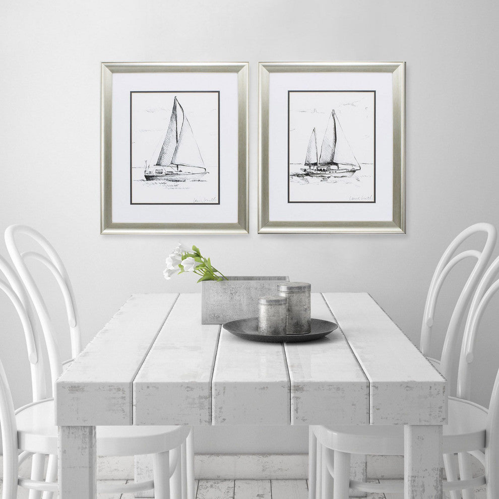 Set of two sailboat sketches are double matted in white and espresso. Framed in a modern brushed antique silver finish moulding.