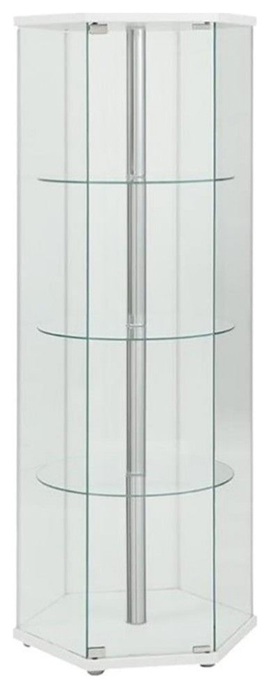 Explore the cutting edge properties of geometric design. Made from glass, this curio cabinet wakes up a contemporary space and puts a new spin on an old classic. Hexagonal in shape, it features a cool center pole for visual effect. Display favorite decor on a trio of round glass shelves.Features: • Includes: One (1) curio cabinet • Wood finish: White • Metal finish: Chrome • Materials: Glass, MDF, metal, engineered veneer • Hexagonal curio cabinet offers visual interest with geometric shape • One magnetic push-to-open clear tempered glass door allows access • Three round clear tempered glass shelves provide strength to support your display items • Chrome shelf support • Glass: Clear tempered glass • Number of shelves: 4 • Number of doors: 1 • Hardware type: Pull handle • Leveler/plastic glide: Plastic glideSpecifications: • Product Dimensions: 24"W x 24"W x 63.5"W • Product Weight: 105.7lbs • Assembly Required: Yes • Warranty: One (1) limited manufacturer warranty