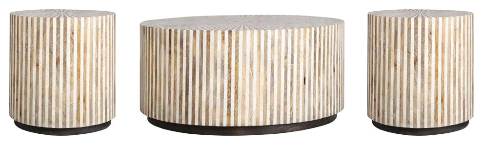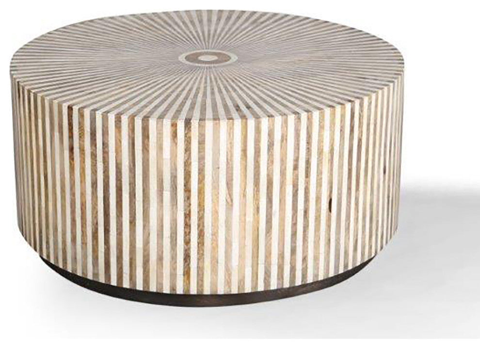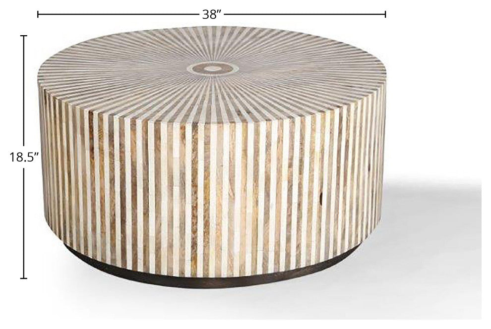 A natural fit for urban and suburban home decor, the Downtown round cocktail table offers a casual luxury with a youthful, slightly Boho vibe. Organic yet refined this 38 inch diameter table is made from mango wood and bone inlay in a beautiful radial pattern. Casters have been added for easy mobility.Features: