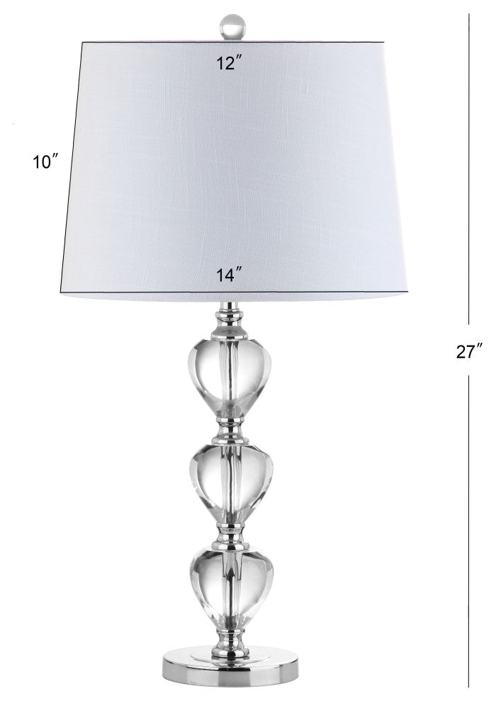 Make room for traditional elegance, as a column of crystal stacks up and sparkles from every angle. The round base of our lamp continues the aesthetic while a slightly tapered linen shade enhances the light''s reflection. Topped with a crystal finial and finished with a silk-wrapped 60" cord, this lamp will add traditional glamour to any home. -Classic crystal styling works with any style of dcor or color scheme-100% cotton hardback tapered drum shade-60" silk cord with standard USA 2-prong plug -On-off switch on socket-Takes one maximum 100 watt or equivalent bulb -Eco-friendly 9W LED bulb included-UL Listed-Color: Clear with white shade-Body Material: Crystal-Base Material: Iron-Finial Material: Crystal-Finial Color: Clear-Harp Color: Silver-Includes: One (1) lamp(s)-Minor Assembly Required-Lamp: 27 inches high x 14 inches wide x 14 inches deep-Shade: 10 inches high x 14 inches wide x 14 inches deepYou see a lamp.We see a decorative work of art.A perfectly curved shade casts a dramatic shadow on a floor. A silk cord you never want to hide. LED lightbulbs: as easy on the environment as they are on the eyes. The JONTHAN Y Lighting collection considers every detail from impeccably sourced materials to designer styling. And our prices are so attractive, we''ve transformed a functional necessity into a fashion accessory.JONATHAN Y Lighting a fashion revolution in home dcor.