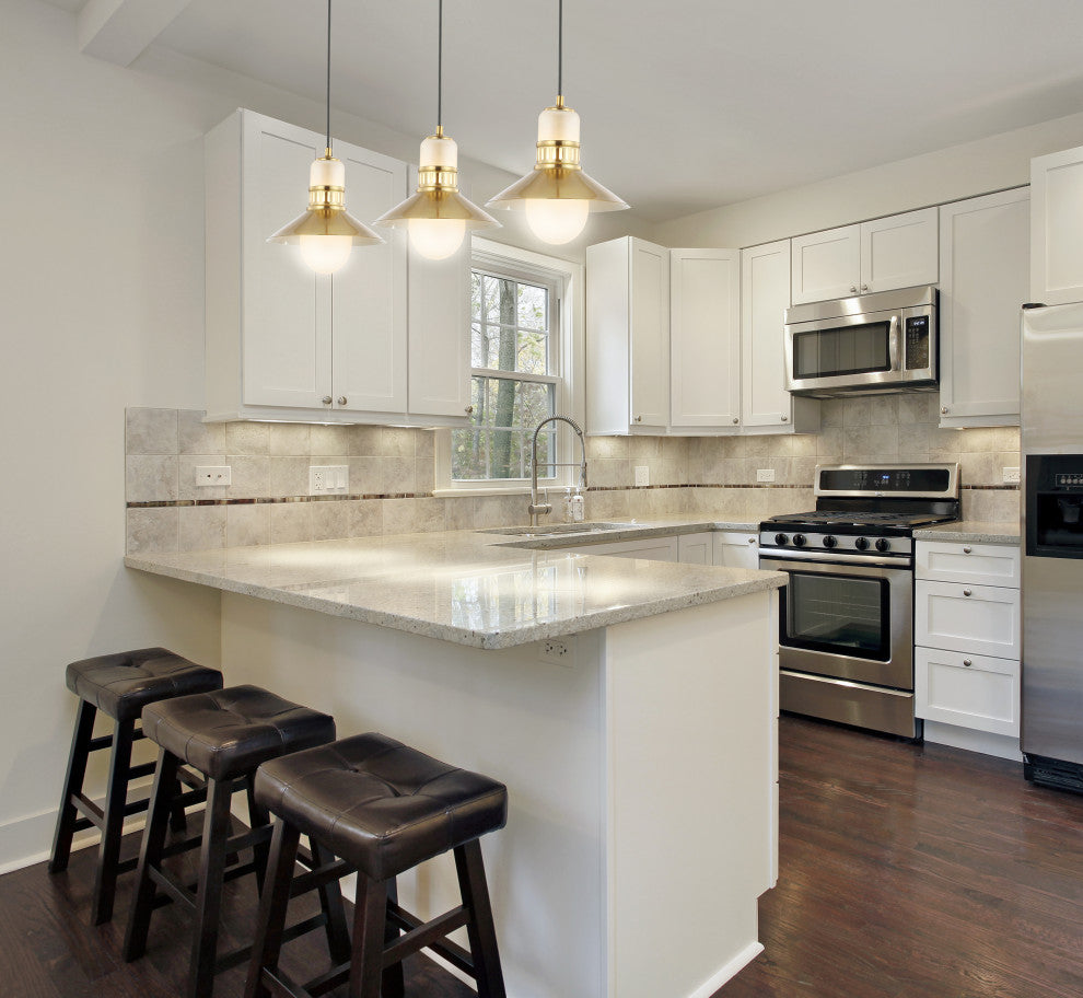 This coastal inspired, linear triple-pendant light has vintage style, dressed up in a brass-gold finish. The metal shades add a bright brass accent, while the frosted glass globes cover the LED bulb for soft, bright light. This versatile fixture with three pendants is perfect over a kitchen island, table, or bar top.Features:- Give your kitchen an instant makeover with our modern triple pendant - just install one light fixture to add three pendants- Suitable for ceilings up to 12 feet, this adjustable linear pendant has six feet of cord- As this fixture must be hardwired, we recommend a professional electrician manage installation- Takes 3 bulbs and compatible with any 9W LED or 40W TYPE "B" or 13W CFL- Eco-friendly 9W bulbs included- Color: White/Brass Gold- Body Material: Metal/Glass- Includes: 1 lamps- Assembly RequiredDimensions:- Lamp: 11-83 inches high x 35 inches wide x 9.75 inches deepAbout us:You see a lamp.We see a decorative work of art.A perfectly curved shade casts a dramatic shadow on a floor. Compatible with LED lightbulbs: as easy on the environment as they are on the eyes. The JONATHAN Y Lighting collection considers every detail from impeccably sourced materials to designer styling. And our prices are so attractive, we''ve transformed a functional necessity into a fashion accessory.JONATHAN Y Lighting - a fashion revolution in home decor.