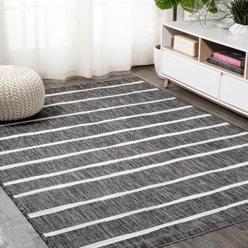 Inspired by Berber rugs, our modern striped rug has a soft, low pile. The scattered stripe pattern recalls the tribal rug designs made popular by mid-century design. With its easy-care fibers, this versatile rug is ideal for a living room, dining room, entry or bedroom.Features:• Power loomed with a 0.19" pile that''s soft and durable• The woven soft black and ivory color scheme brings a modern touch to this timeless rug• Made from easy-care polypropylene - just sweep, vacuum or hose down with mild soap and water• 100% Polypropylene• No backing, use of rug pad is recommended (sold separately)• Power Loomed in Turkiye• Actual Dimension: 9 ft. x 12 ft.• Color: Black/Ivory• Thickness measures: 0.19 in.• Available in multiple sizes and/or colorsRug Care:• Vacuum regularly and spot clean as needed; avoid direct and continuous exposure to sunlight; use brushless vacuum; remove spills immediately; if liquid, blot with clean, undyed cloth by pressing firmly around the spill to absorb as much as possible; for hard to remove stains, professional rug cleaning is recommended; store in a dry, well ventilated area and rotate for consistent wear• Packing and shipping may cause temporary creases in rugs, which will flatten out after a week on the floor; to expedite the process, try back-rolling your rug before laying it down, and then allow ample time for the remaining creases to relax• Please Note: Due to differences in monitors, some rug colors may vary slightly. Lengths and widths may vary from the published dimensions. Patterns may vary slightly according to shape and size selected.About us:Style your floors with JONATHAN Y. By combining fine craftsmanship and design, this New York creative studio is bringing fashion to your floors. The collection mixes sustainable organic materials, vibrant colors and trend worthy styles to create JONATHAN Y''s distinctive catalog of rugs.