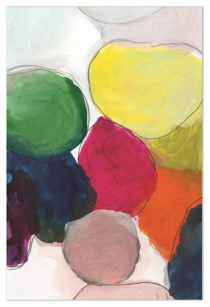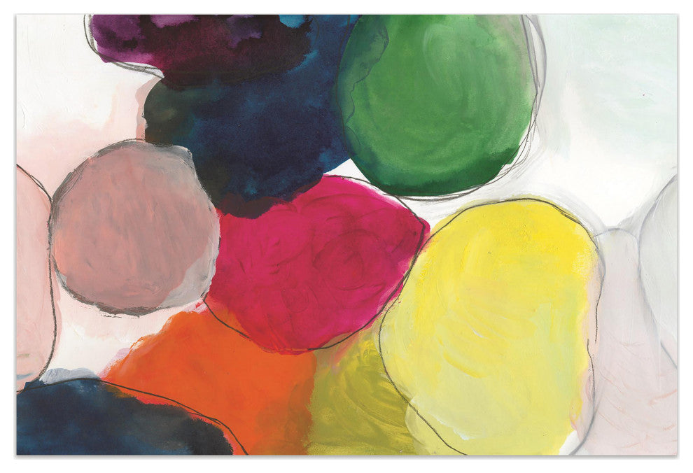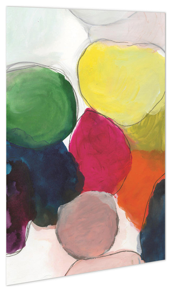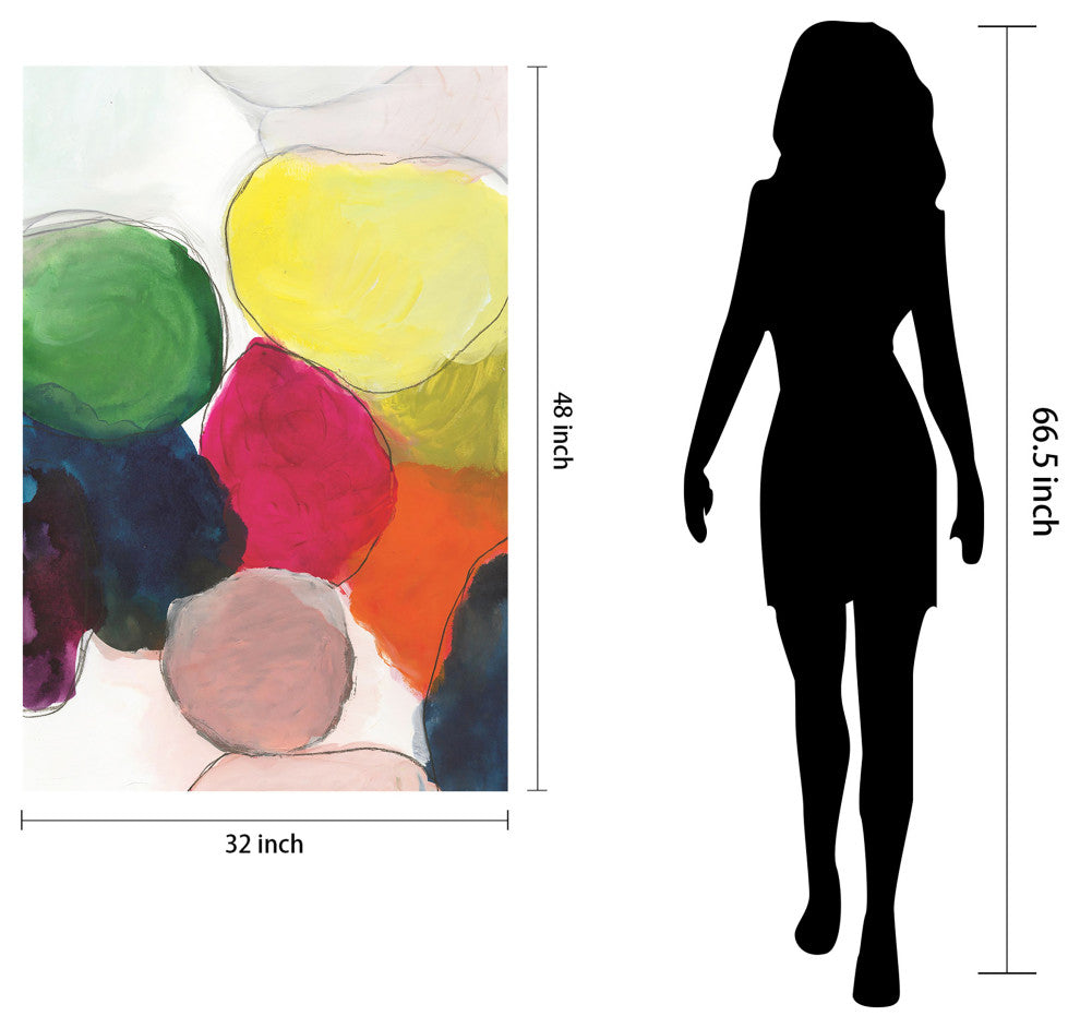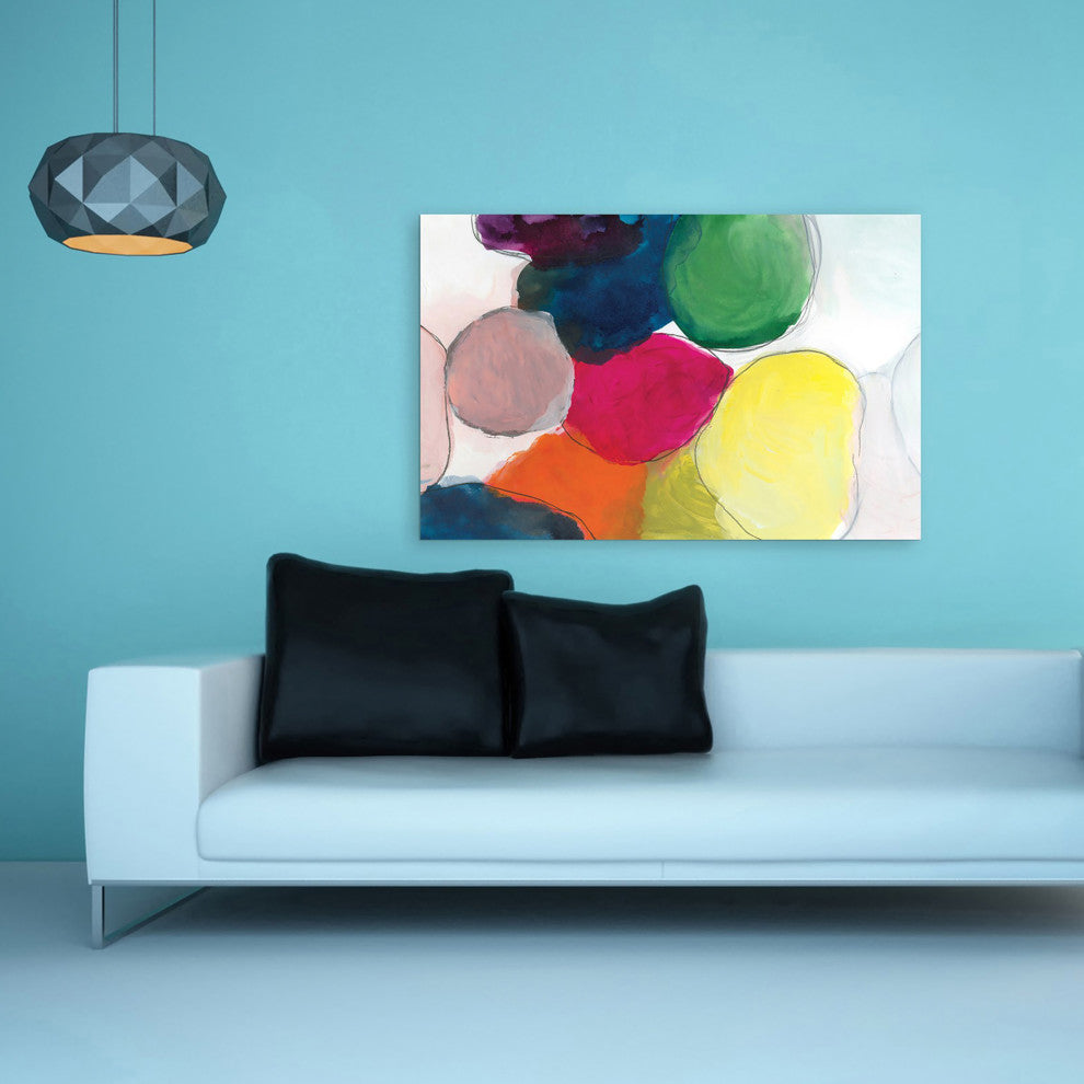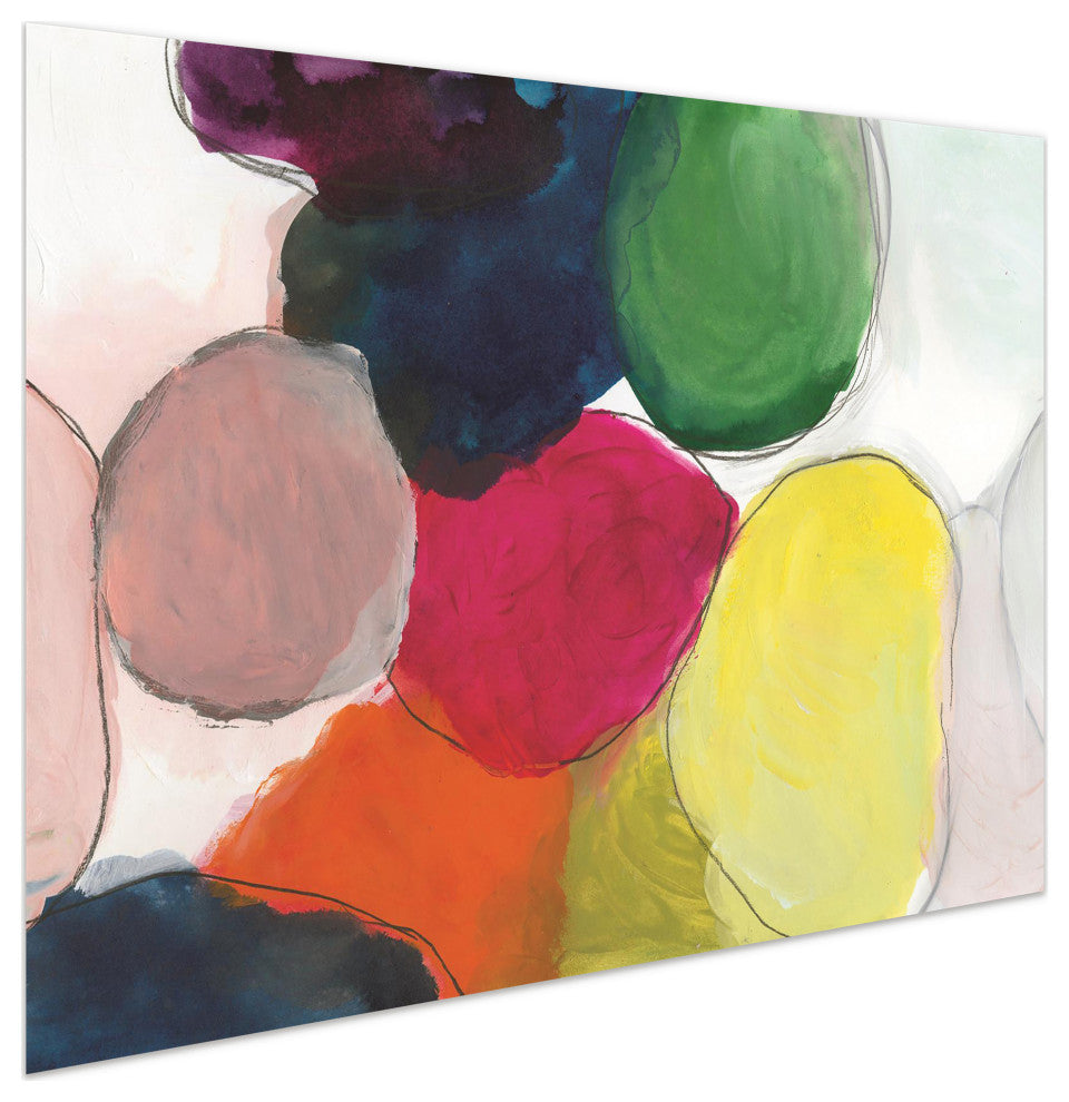 In this festive work of art, we see what could be party balloons twirling in the air as if for a child"™s birthday party. The many abstract orbs in a variety of pastel colors will definitely add to the party atmosphere. A lively piece such as this would be perfect to brighten up a young one"™s room or add a bit of fun to any room in the house. Viewing the piece from the reverse of the painted side adds great depth, causing the colors pop out. 2 strong steel hangers are attached to the back of the product for quick and easy installation.