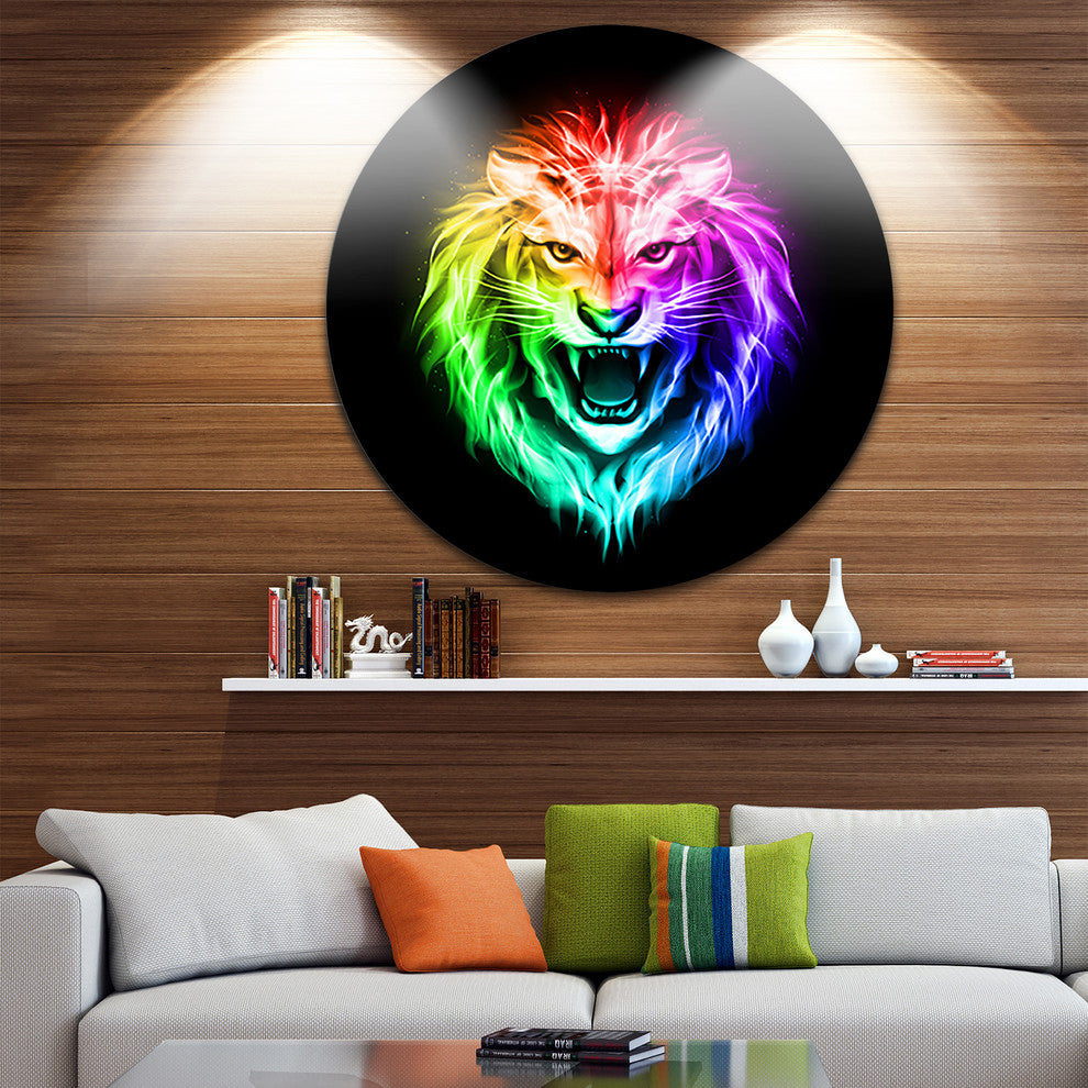 Colorful Fire Lion, Animal Digital Art Large Disc Metal Wall Art, 23"