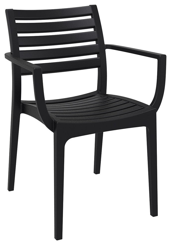Artemis resin dining set with four armchairs and one square table. Made for commercial durability. Chairs are stackable. UV treated. Hose down for cleaning. Withstands outdoor temperatures summer and winter. Table has levelers for uneven surfaces. No metal parts. Chairs are heavier than most resin chairs of its type. Dining set is perfect for heavy use areas. Set items are 100% resistant to outdoors, sun, snow, salt. Resin is virtually maintenance free.Made from commercial grade resin. 100% Polypropylene. Recyclable.Extremely durable for outdoor temperatures.Both chairs and table resistant to U.V, chlorine, salt, stains, suntan oils. Easy to keep clean. Perfect for heavy use in any indoor or outdoor areas. Legs have levelers for uneven surfaces. Chairs stack.Chairs: 23"W x 23"D x 33"H Seat Height: 18"Chair Arm Height: 26.5"Table: 31.5" W x 31.5" L x 29" H.
