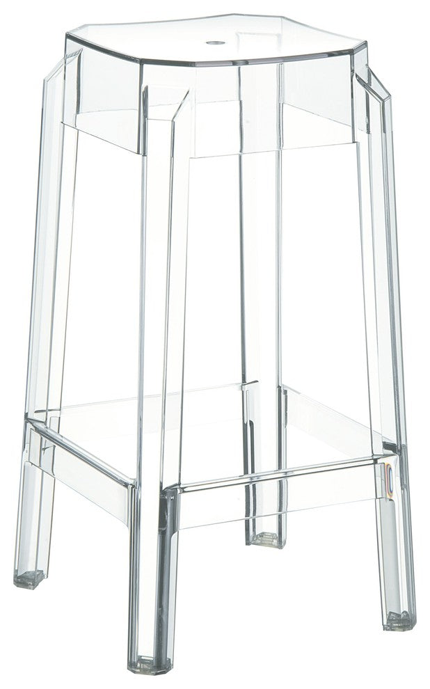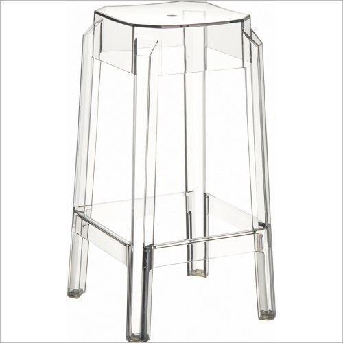 Fox polycarbonate counter stool. Modern contemporary design. Can be used both indoors and outdoors. Scratch resistant. Commercial grade plastic polycarbonate resin. Strong legs and structure. Stackable.