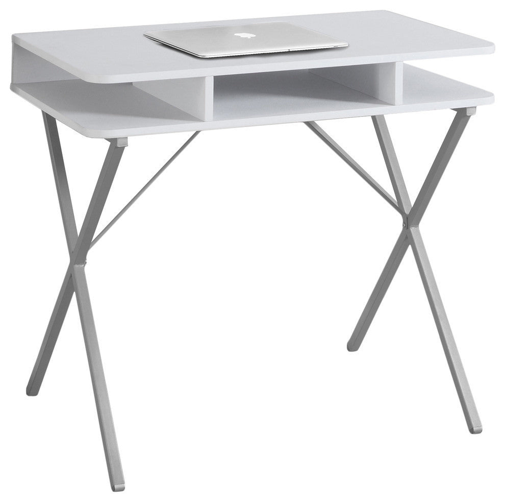 Redefine your workspace at home or even at the office. This sleek, minimalist white writing table includes three open cubbies to handle all your office supplies while keeping the surface space clean and tidy. This ensures a comfortable and efficient computer table or office desk, allowing you to get the job done in due time. Perfect in small spaces, the metal criss-cross legs provide a sturdy table top to meet your working needs.Features: • Open cubby work desk featuring plenty of space for office supplies to keep the writing table tidy • Space-saving design makes this an ideal compact desk in small homes, apartments or condos • Unique metal X design legs provide optimal sturdiness and contemporary styling • Finished on all sides, this white desk brightens up your office space and can be placed virtually anywhere • Product Dimensions: 32 Inch L 20 Inch D x 30 Inch H