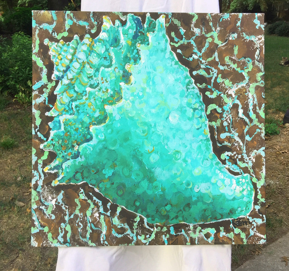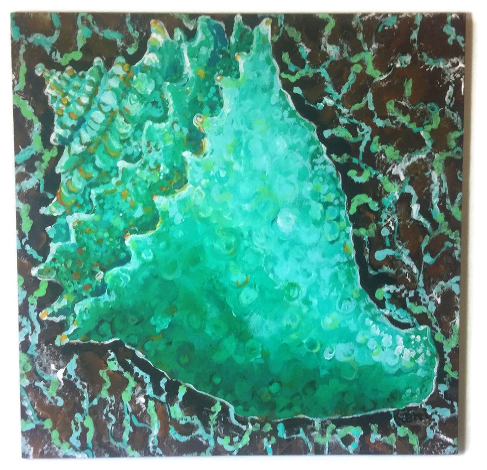 Conch Shell Giclee is gallery wrapped canvas art. It Is Mounted On1" Frame and is In Shades Of Blue, Aqua, Teal, Brown And More. . Reproduction Of Original By My Island Artist, Gerri Hyman.