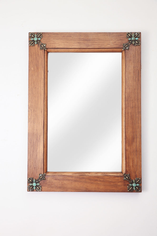 We take pine wood to create this unique mirror. We antique this rustic mirror in an aged natural tone and finish it off with turquoise concho crosses at each corner.