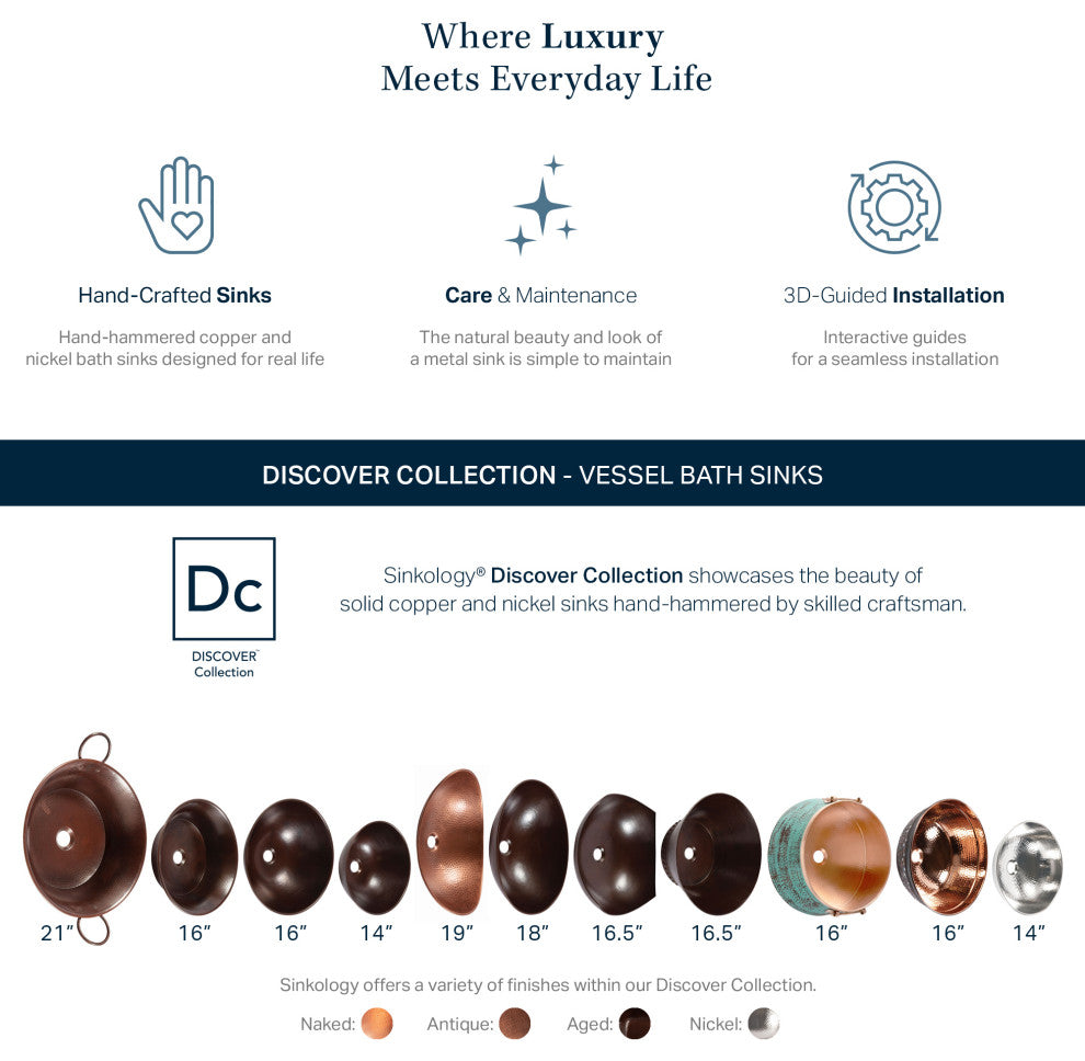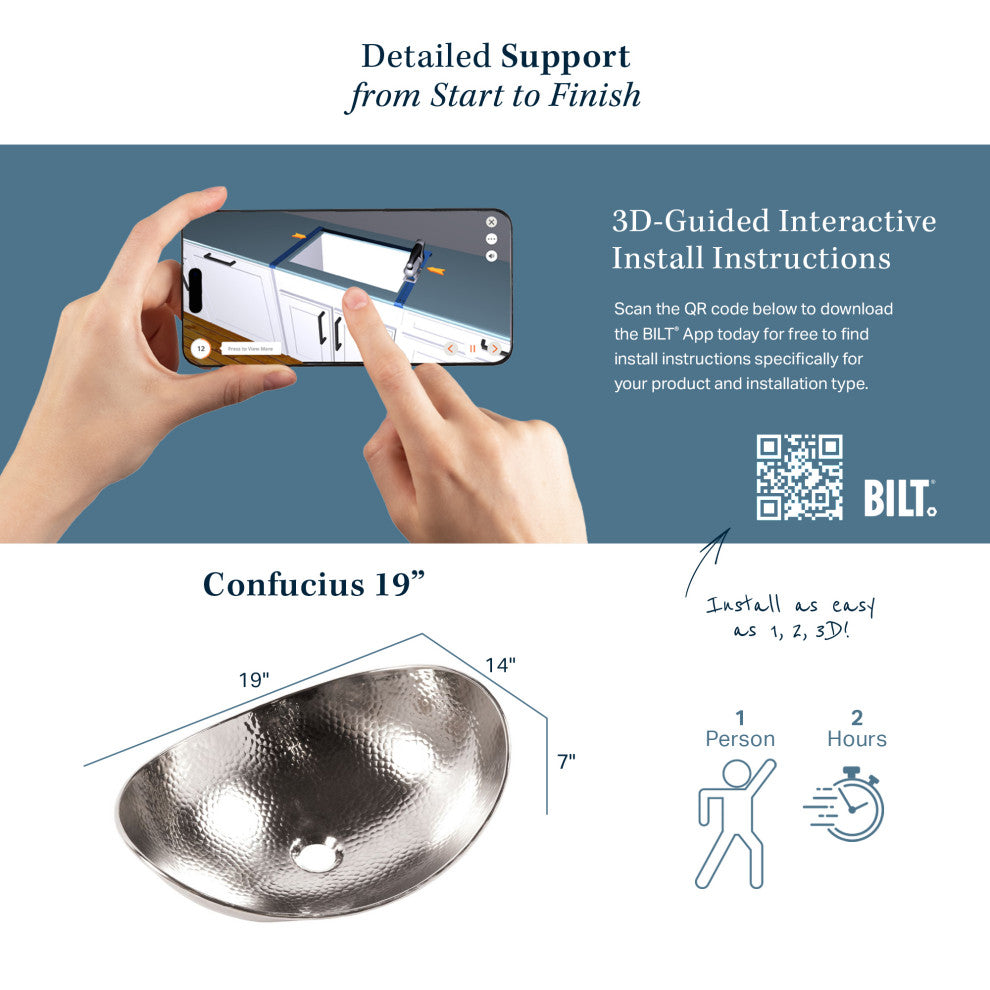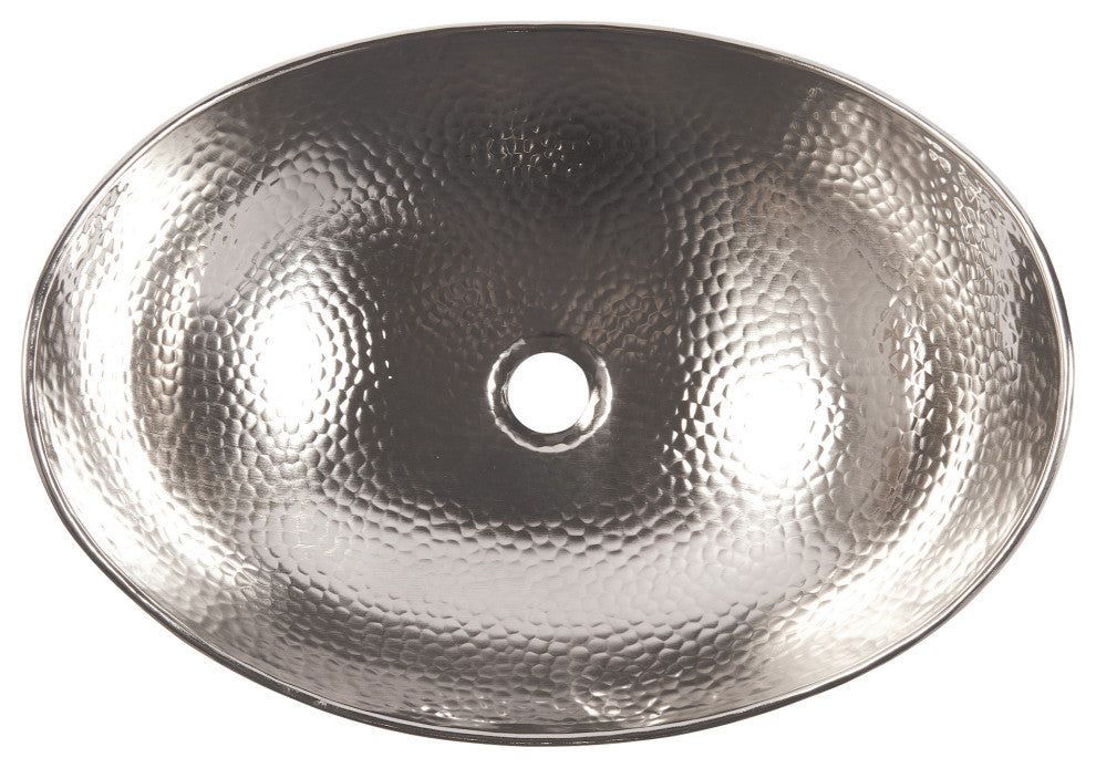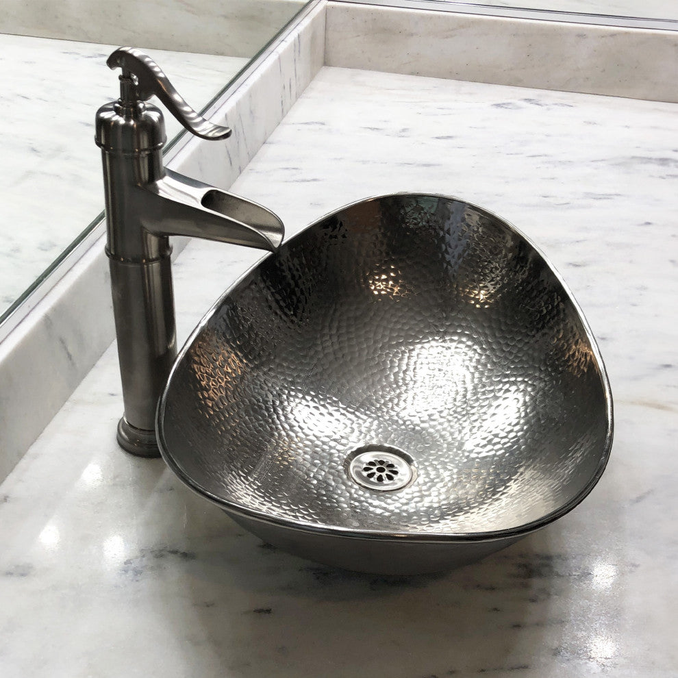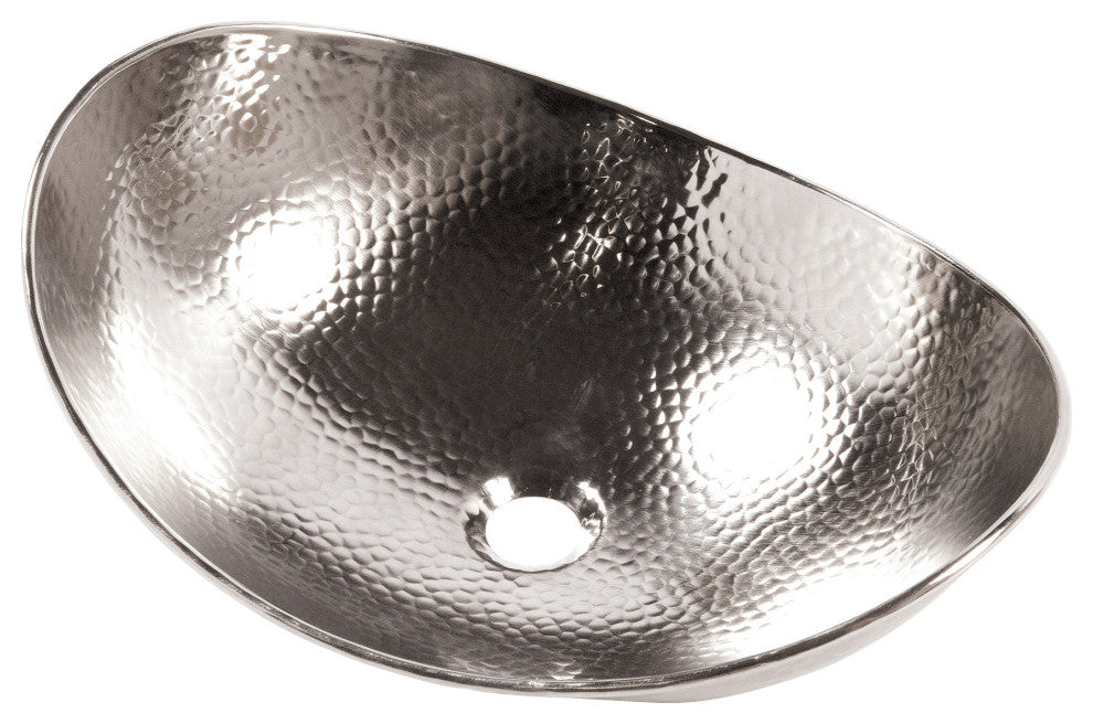 A bathroom should be a place of peace and serenity. The Confucius vessel nickel bath sink adds an aesthetic of tranquility and elegance to your space. The boat-shaped design of the copper bowl reduces splashing and adds keeps water where it belongs - in the bowl. This durable, solid hammered brass sink is nickel-plated by skilled craftsman for beauty and strength, and is protected by our lifetime warranty.Dimensions: 19" x 14" x 7"Vessel design sits atop a vanity and provides max countertop space - above and belowBoat-shaped bowl designed to reduce water splashingHand-hammered, solid 16-gauge brass plated in nickel sink is protected by our lifetime warrantyNickel-plated brass gives a luxurious, high-impact shineRecommended Products: SinkSense 1.5" Pop-Up Sink Drain in Nickel - No Overflow (#P15-N)SinkSense 1.5" Grid Sink Drain in Nickel - No Overflow (#G15-HN)Stainless Steel Care IQ Kit (#SARMOR-701)