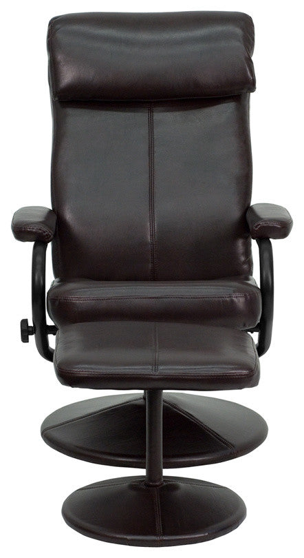 Contemporary Leather Recliner and Ottoman With Leather Wrapped Base, Brown, 26.5