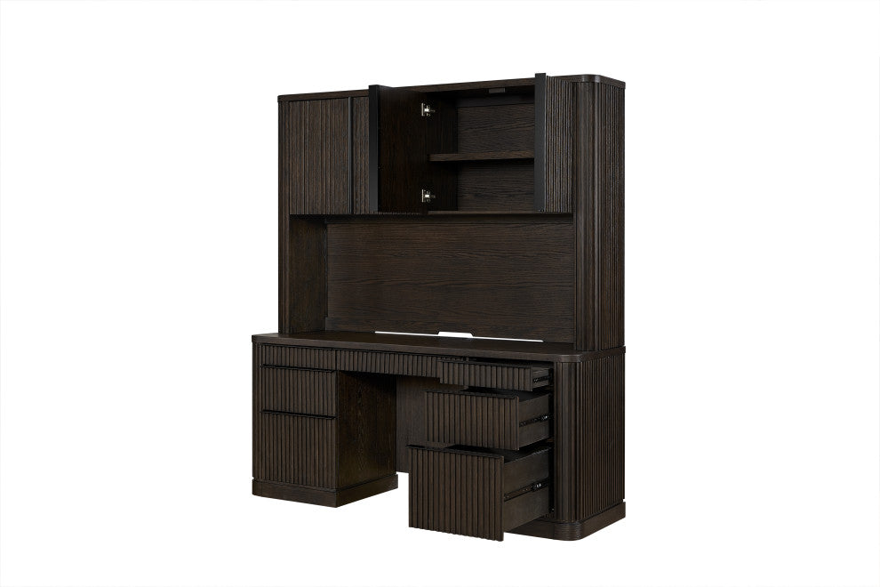 Elevate your workspace with the modern Tulane Office Collection, meticulously crafted to inspire productivity and style. The standout feature of the collection is its unique slat fluted tambour detailing, an element that adds depth and texture, creating an inviting atmosphere that encourages creativity and focus. Each piece in the collection showcases this exquisite craftsmanship, making a bold statement in any office setting.