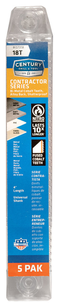 Reciprocating Saw Blade Contractor Series Cobalt Bi-Metal 18T X 4" 5 Pack. Width 3/4", Thickness 0.035". Application: Ferrous/Non-Ferrous Metal Over 18 Gage -1/8", Pvc And Fiberglass.