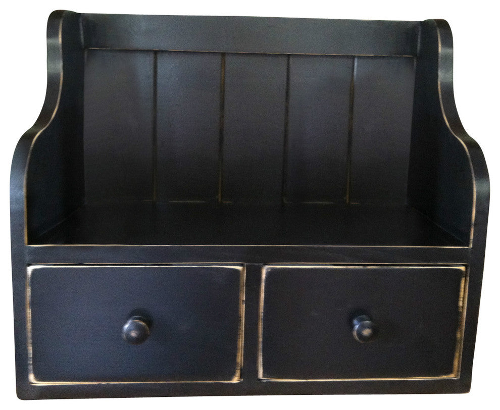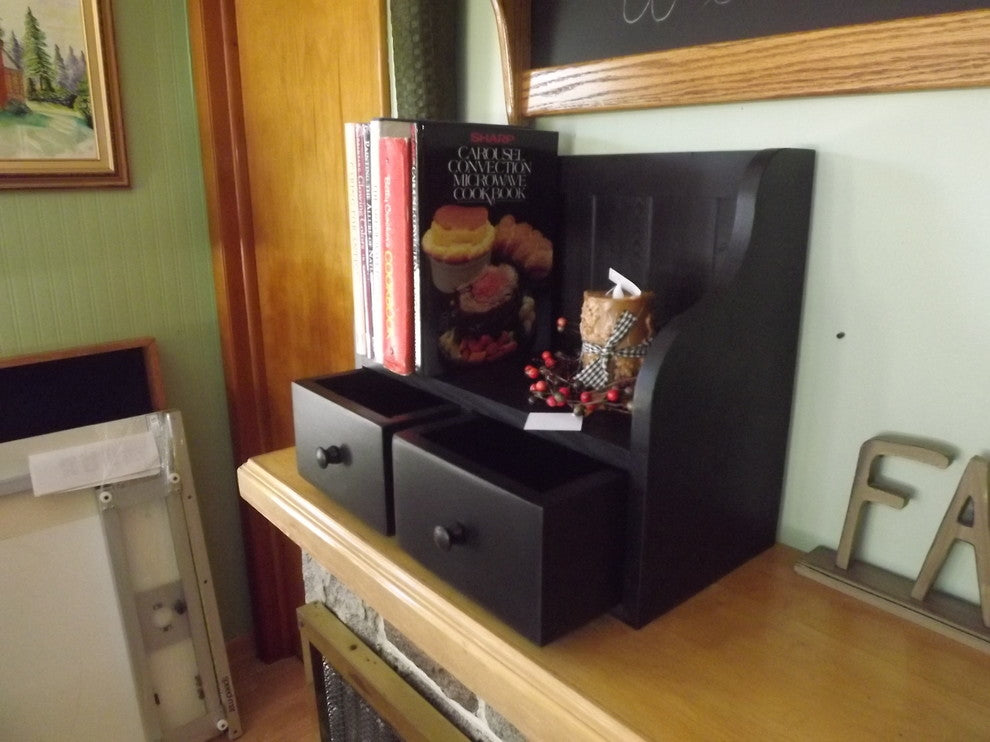 This country primitive piece is perfect for diplaying and easily storing your cook books and recipe cards all in one. It measures an overall 16.75" tall x 19.5" wide x 9.5" deep. The cook book display area measures 10" tall x 18" wide. It has 2 drawers for recipe card storage or any of your odds and ends. Each drawer measures 7" wide x 7.5" deep. We offer it in antiqued distressed black, white, navy, green, espresso and squash.(picture included for color options) • • • •  IMPORTANT INFORMATION• • • • THIS ITEM IS NOT MADE UNTIL ORDERDBuild and Ship Time: Current build time is estimated at 2-4 weeks. We do try to have items shipped out within 15 business days but this time fluctuates depending on the current work load. We apologize for any inconvenience this may cause. PLEASE NOTE: This item is built custom once it is ordered. The item you are purchasing is a handcrafted original. It may not appear exactly as shown. Additional items shown in the picture are not included but some are available for sale. All of our items are one of a kind as each item is handcrafted individually here in our shop in Ohio.