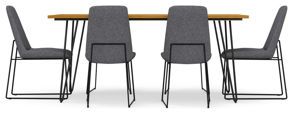 Elevate your dining space with the Hunter and Corina Dining Set, a perfect blend of modern sophistication and industrial charm. The 66-inch rectangular oak veneer table, featuring unique wood grain patterns and a durable lacquer finish, comfortably seats six. Its black metal hairpin legs create an airy, open feel ideal for smaller spaces. Paired with the table are six Corina dining chairs, upholstered in soft grey linen-look fabric. These chairs boast contoured seats with high-density foam padding for lasting comfort, supported by sleek powder-coated black metal sled bases. The set''s contemporary aesthetic, combining solid wood and metal elements, suits various interior styles from minimalist to industrial. Durable and easy to maintain, this dining set promises to be the centerpiece of countless memorable meals and gatherings.