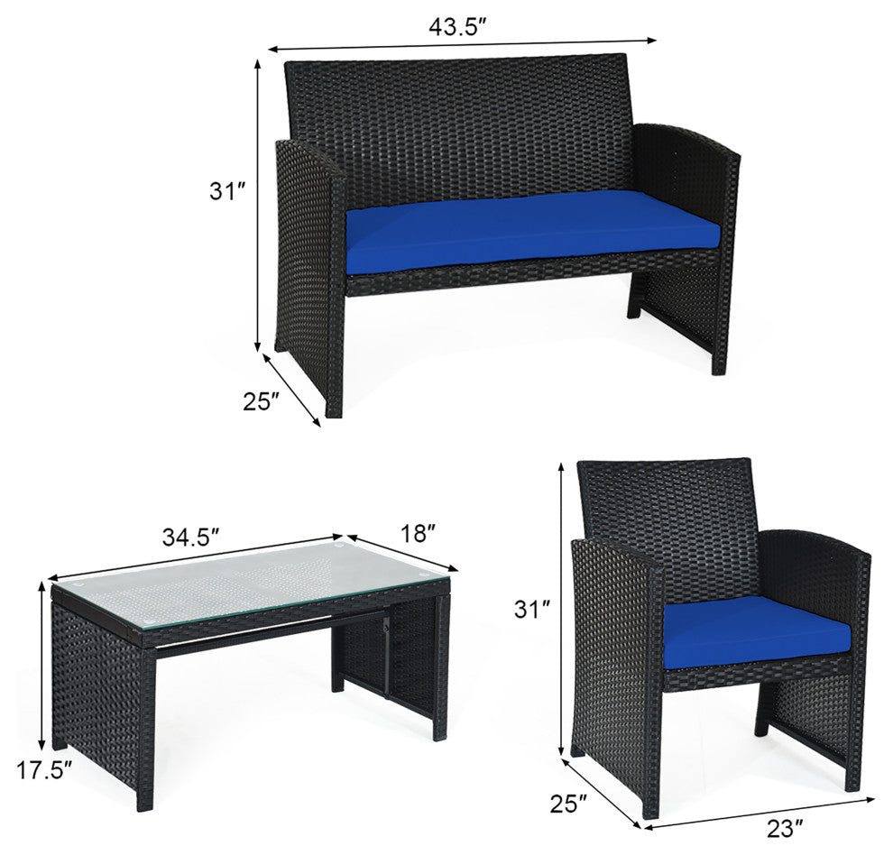 It''s time to replace the outmoded outdoor furniture with our modern 4-piece patio wicker sofa and table set. Featuring with classic style and high-quality materials, our patio rattan set are ensured to last long. The softly cushioned wicker patio sofa set chairs are for maximum comfort and excellent seating experience. Powder-coated steel and anti- faded PE wicker provide sturdiness and durability to this patio furniture set. If the cushions get dirty by accident, you can simply zip off the cover and wash the covers. Besides, the coffee tabletop is made of tempered glass, so you can wipe it off with damp cloth. This set of rattan furniture can be placed in your courtyard, balcony and poolside for you to have a gathering or conversation with drinks and food. So make this furniture set yours and be sure to share the best of times with your dear ones.