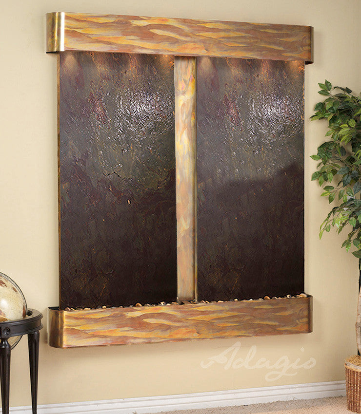The Cottonwood Falls water fountain is a stunning addition to your home or office. It features two panels of natural slate, marble, mirror, or FeatherStone along with your choice of metal trim finish. The peace and tranquility that the sound of running water brings will calm all those who are fortunate enough to hear it. Full color instructions and the EZ install bracket simplifies hanging this water feature. 61" L x 69" H x 6" D, easy to hang, complete with colored instructions and hardware for hanging on a sheetrock wall. Hanging Weight 180 lbs.This unit includes: 6 halogen lights Polished river rocks Electric pump 3-way pull chain that allows you to run just lights, just water, or lights and water. Welded plastic liner insures against leaking and unique water distribution unit system will not clog. 110V, 100W; one cord operates entire unit; 90 degree plug can be concealed behind water feature. Durable powder coat finish; Manufactured and assembled in the USA with a 1 year limited warranty. • This light-weight slate veneer known as FeatherStone is natural stone and therefore may differ in color and texture from the photos shown.