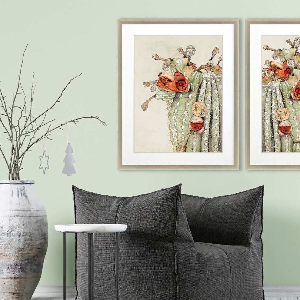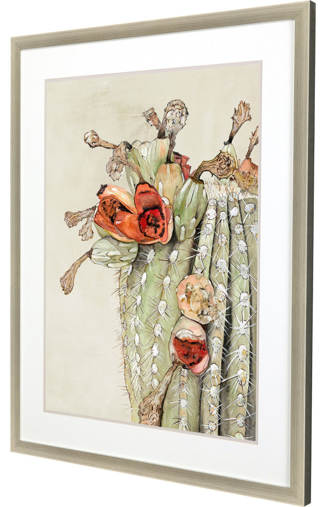 A blooming cactus flourishes with eye-catching blossoms. Double-matted in white and putty. Framed in a silver leaf block profile wood.
