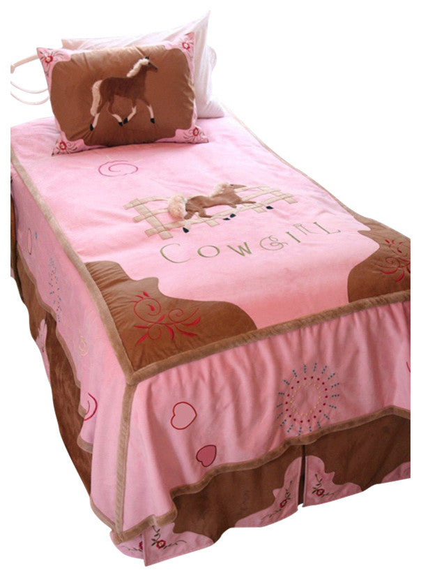 Your little rodeo princess will love our Cowgirl bedroom set! Our super-soft microfiber suede bedspread is lined with an even softer faux shearling for luxurious comfort, and it''s all machine washable and dryable. Horse applique and embroidered designs add a feminine flair to the frontier air, and the bedspread, pillows, and window treatments are the perfect blend of sugar, spice, and sheer cowgirl nice. If you''re looking to add a touch of beauty to the bunkhouse, bring home our Cowgirl collection!Full: 82" x 89", four pieces
