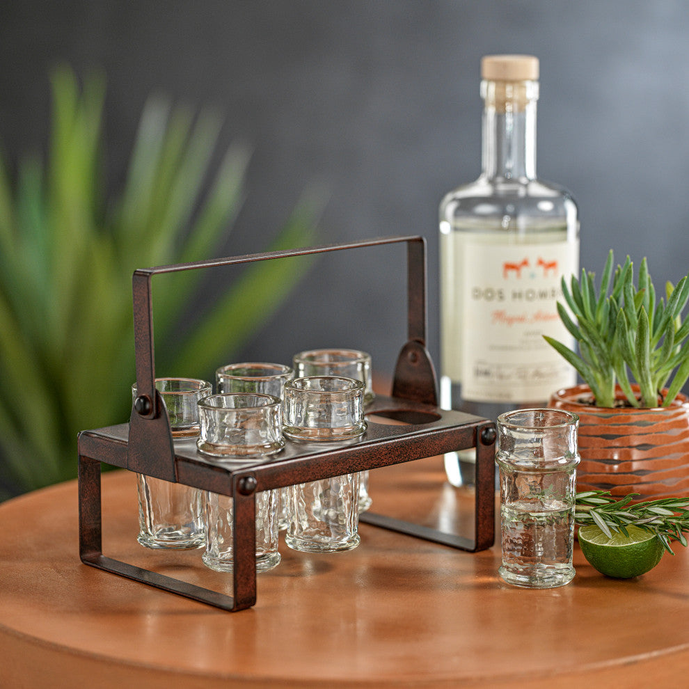Get the party started with this festive and attractive tequila shot set. Comes iron frame stand that holds 6 full size shots. Everyone will know where the fun is at once this set is introduce to the celebration. �Set of 6 shot glasses �Clear hammered glass �Rust powder coat iron glass holder�Shot glass measures 1.4"dia x 3"height�Glasses are hand wash only