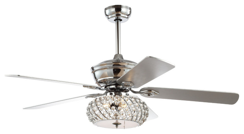 This 52" modern glam ceiling fan will add some sparkle to your ceiling. The chrome finish is complemented by five reversible blades in silver maple or white. Crystal balls are set into a chic chrome light that''s finished with a mirrored base. Features:• This fan-light combination''s silvery tones add a touch of modern glam to your living room, bedroom or family room• Pull-chain control provides 3 different fan speeds• Includes 5 White/Silver Maple reversible blades• Fixture can be adjusted to your desired length• Eco-friendly 9W bulbs included• Color: Chrome with clear shade• Body Material: Iron• Includes: One (1) lamp• Assembly RequiredDimensions:• Lamp: 21-26 inches high x 52 inches wide x 52 inches deepAbout us:You see a lamp.We see a decorative work of art.A perfectly curved shade casts a dramatic shadow on a floor. Compatible with LED lightbulbs: as easy on the environment as they are on the eyes. The JONATHAN Y Lighting collection considers every detail from impeccably sourced materials to designer styling. And our prices are so attractive, we''ve transformed a functional necessity into a fashion accessory.JONATHAN Y Lighting - a fashion revolution in home decor.