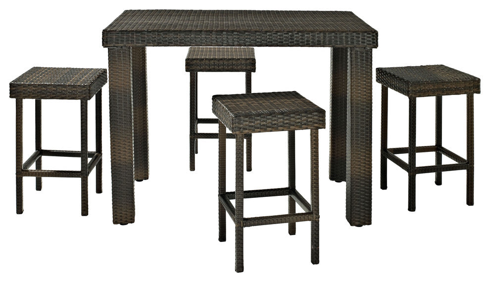 Enjoy outdoor dining with our elegantly designed, all-weather wicker high dining set. This collection features clean-lines and is finely crafted with intricately woven wicker over durable steel frames, providing lasting resiliency to the weather. With enough table space and stools for a party of four, this set is sure to provide the utmost comfort and style in any setting. Includes dining table and four stools.Features: • Finish: Brown • Material: PE Board 5%, PE Wicker 35%, Steel 60% • Set Includes: 1 dining table and 4 stools • UV-resistant outdoor resin wicker • Durable steel frame • Easy to assembleSpecifications: • Product Weight: (Patio Dining Table) 42.9 lbs • Product Weight: (Stool) 8 lbs • Patio Dining Table Dimensions: 36" H x 48" W x 30" D • Stool Dimensions: 25" H x 15" W x 15" D