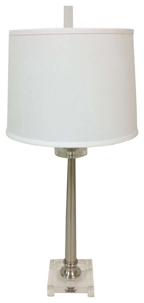 Enhance your living room with the Crystal Table Lamp, shown here with a nickel finish. Made of steel and crystal, this piece will illuminate your space with a beautiful ambience and measures 34 by 6 inches.