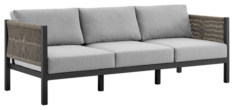 Mixed materials are all the rage, and the Cuffay 4 Piece Outdoor Patio Furniture Set in Aluminum and Rope with Cushions combines aluminum, weather resistant upholstery and beautiful textured rope to create the perfect outdoor seating experience. This 4-piece outdoor set includes a 3-seater sofa, 2 club chairs, and 1 rectangular coffee table. The combined materials showcase a fashion forward design that is beautiful and durable. Aluminum furniture cannot rust. This is especially beneficial in areas where moisture is present, making it a premium choice among residents of coastal cities or regions with high humidity. Polyester fabric is very easy to clean. This makes it a good option for outdoor cushions that will probably be covered with dust, dirt, and other outdoor grime regularly. In addition, most outdoor furniture is used as part of an eating area, making more stains and messes a real possibility. Polyester cushion covers can be thrown in the laundry and are naturally difficult to stain permanently. These weather resistant materials will stand up against UV, rain, and sun. This 4-piece conversation set makes a beautiful addition to your backyard, patio, pool area, or screened in porch. The Cuffay 4 Piece set is available in your choice of brown aluminum with brown rope and cushions, or black aluminum with grey rope and cushions. PRODUCT DIMENSIONS - CHAIR DIMENSIONS: 29"W x 31"D x 26"H x 16" Seat H / SOFA DIMENSIONS: 81"W x 31"D x 26"H x 16" Seat H / TABLE DIMENSIONS: 43"W x 28"D x 15"HSET INCLUDES - This 4-piece outdoor furniture set features a 3-seater sofa, 2 club chairs and 1 rectangular coffee tableWEATHER RESISTANT UPHOLSTERY - The polyester upholstery is not permeated easily by water. Secondly, polyester resists the types of molds and mildews that will take root in fabrics made of natural fibers, making it ideal for patio furniture.EASY MAINTENANCE - The cushions feature a zipper closure that allows you to remove the covers for easy washing. Aluminum is very easy to clean, wipe with a cloth or use hose to spray down.COLOR PREFERENCES - When shopping for furniture, you often find yourself limited on color options when you finally find the right piece for your home. Armen Living offers a unique variety of color and finish options that are sure to fit into any existing design theme.RUST FREE FRAME - Aluminum furniture cannot rust. This is especially beneficial in areas where moisture is present, making it a premium choice among residents of coastal cities or regions with high humidity.NO HASSLE ASSEMBLY - Look no further for beautiful, functional, and easy to assemble furniture for your home. This piece of furniture requires assembly and comes with clear and concise step by step instructions that make set up a breeze!STANDING BEHIND OUR PRODUCTS - Armen Living stands behind all products sold and gladly offer our customers a 2 year limited manufacturer warranty on all items. Our products are made from high quality materials that will last for many years to come.