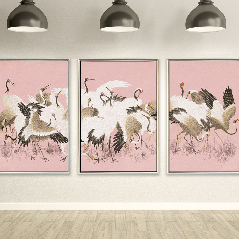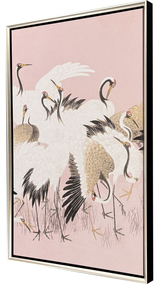 A flock of cranes explore their surroundings. Giclee on canvas is mounted in a warm silver finish floater frame with a satin black side.