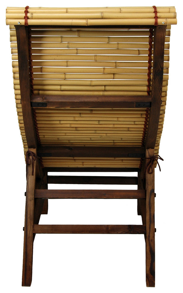 Japanese bamboo all-wood lounge chair features a curved seat and back design fitting the contours of the body for maximum relaxation. Sturdy wood frame is finished in a dark stain with visible wood grain. Bamboo rod mat retains its natural light color and is stitched together with bright red string. Place a pair on the deck, porch, or poolside as part of an Oriental, exotic, tropical or rustic theme. As with all outdoor furniture, storing during harsh weather for the longest product life.
