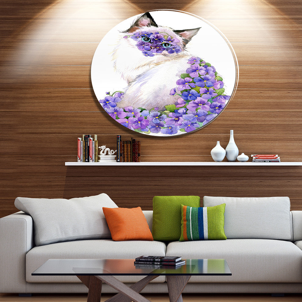 Cute Cat With Blue Flowers, Animal Disc Metal Artwork, 36"