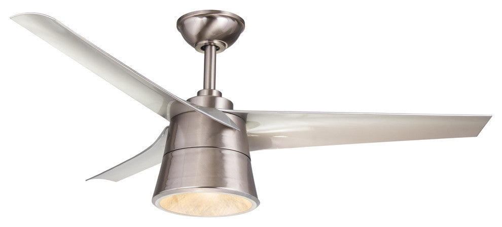 Ceiling Fan in the stainless stell Finish, silver blades with integrated 17w Dimmable LED Blade Finish: Silver Blade Pitch: 11 Blade Span: 52"Blade Type: ABS Down Rod includedUL Approved (Y/N): YBulb Included: YesNumber of Bulbs: 1Bulb Type: LEDWatts Per Bulb: 17Total Wattage: 17Product Type: Hanging Dimmable: YesVoltage: 120Downrod(s) Included: Yes Genre: Modern Speeds: 3 speedsReversible: Yes Motor Type: ACCFM (High): 5488Pull Chain Included: NoRemote Included: YesWall Control Included: NoReceiver Included: YesNumber of Blades: 3Blade Span: 52Blades Included: YesBlade Material: ABS Plastic Reversible: NOBlade Pitch: 11Light Kit Included: YesLight Kit Adaptable: NoLight Kit Type: Integrated Light Kit Location: DownShade Description: Frosted Opal GlassShade Material: Acrylic Color Temperature: 3000kDownrod 1 Quantity: 1Downrod 1 Size: 4.5
