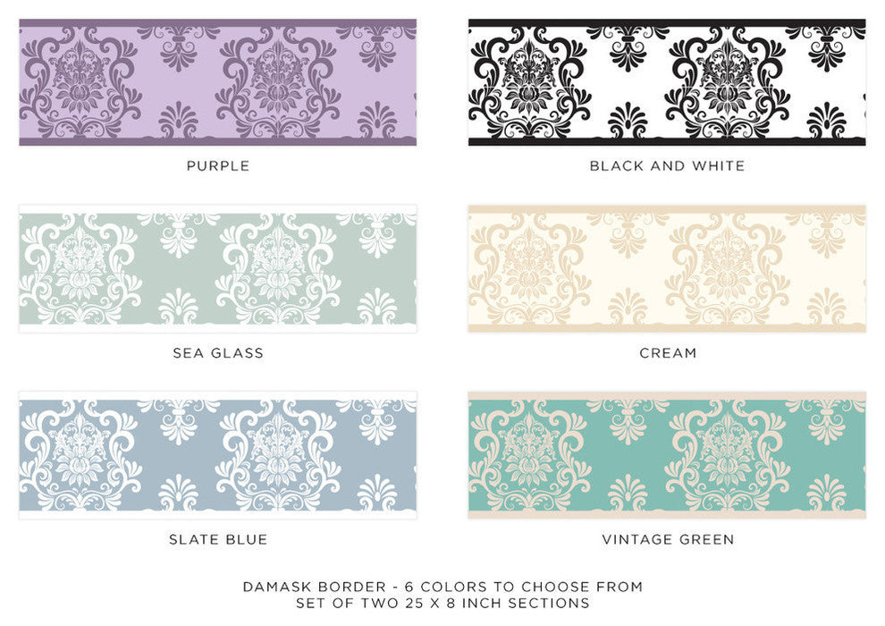 Our damask wall border fabric wall decals will add an awesome design element to any room whether you''re looking to accent one wall or wrap it around the whole room. Each set comes with two 25" x 8" sections that can be joined together to form a continuous line. They are made from a high quality fabric material that is reusable and repositionable so they are super easy to apply. IMPORTANT - PLEASE READ: This is for 2 sections only measuring 25 inches wide each. Please measure your wall or room in order to make sure that you order enough sets. Available in 6 color options 1) Black and White 2) Purple 3) Sea Glass 4) Cream 5) Slate Blue 6) Vintage Green Product Dimensions: (width x height) 2 Sections: 25" wide x 8" tall (each) STILL NOT CONVINCED WHY FABRIC WALL DECALS ARE SUPERIOR TO VINYL? The material for our fabric wall decals is many times more expensive than vinyl but it''s worth the extra cost. It''s made of natural fibers and a water based adhesive so it won''t damage your walls and can be repositioned many times. It''s extremely easy to install because it doesn''t come in a complicated puzzle and you don''t need any tools or diagrams. It won''t shrink or curl like vinyl and the matte finish looks like a mural has been painted on your walls. We have the most competitively priced fabric wall decals that you can find online. Our quality is unmatched and we hope that you love our designs as much as we do!High quality fabric material with a water based adhesive, this is not cheap vinyl like most of the decals you find onlineProudly made in the USA - Non-toxic, Phthalates free, BPA free, PVC freeReusable, repositionable, material will not shrink, stretch, or curl. Our fabric decals will work on most surfaces including textured wallsProduct Dimensions: 2 Sections: 25 Inches wide x 8 Inches tall (each). Easy to apply with no special tools or transfer paper required. Can be pulled apart if it folds over during installation.