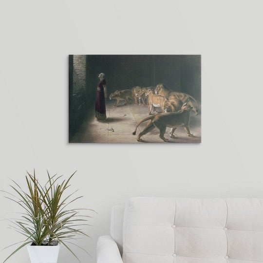 Gallery-wrapped canvas entitled, "Daniel in the Lions Den, mezzotint".Religious artwork of a scene from the Old Testament in this painting from the late 19th century.Our wrapped canvases feature a proprietary design that prevents warping or sagging over time. By using archival inks and artist-grade canvas, our premium canvases are sure to add that extra touch to any space. Lastly, our canvases are finished with a closed back that incorporates pre-installed hanging hardware for easy installation.