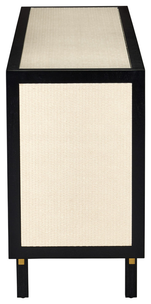 The Deanna Console Table has panels of woven raffia on its top, sides and shelves that are surrounded by black strips of Okoume woodto coordinate with the table"™s legs. The combination of black and ivory brings this piece a tailored feel that fits within a wide spectrum of design styles, especially a room that exudes Hollywood glamour. The subtle texture of the raffia is a special aspect of this design, as is the fact the table and shelves are fitted with inset glass to protect the natural fibers. A plinth base is made of metal in a brushed brass finish, the clean lines bringing added sophistication to the piece.